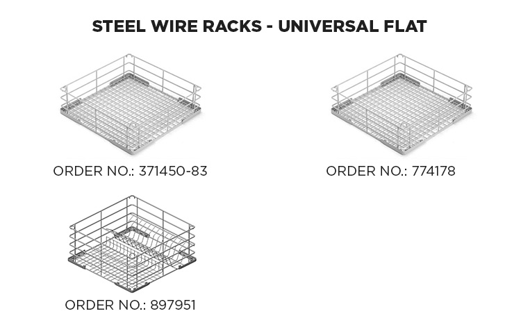| 371450-84 | Uniwersalny kosz na kieliszki 400 × 400 mm, z 4 nachylonymi rzędami po 90 mm, wysokość 175 mm |