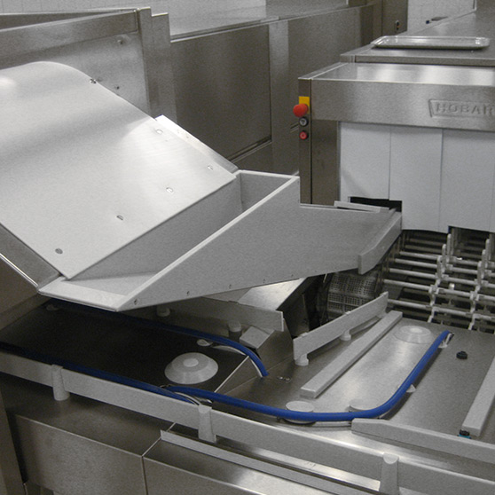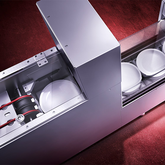 Automatyczny system rozdziału oddziela wszystkie zmywane artykuły, przeprowadza wstępne zmywanie i umieszcza je na odpowiednich torach zmywarek z transportem taśmowym. Zintegrowany system czyszczenia wstępnego jest wyposażeniem uzupełniającym stosowanym z dodatkowym oddzielnym zespołem usuwania zanieczyszczeń.