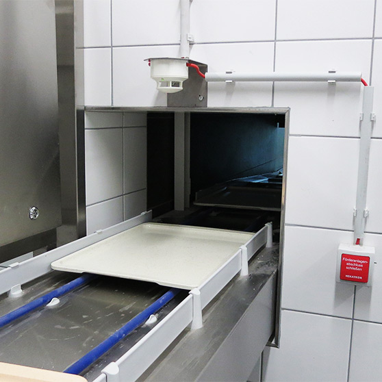 Przenośniki z okrągłym pasem używane do przenoszenia tac często przechodzą przez sekcje ochrony przeciwpożarowej. W takim przypadku wymagane są specjalne zamknięcia przenośników taśmowych, które będą w stanie np. odizolować jadalnię od zmywalni w razie pożaru, zapobiegając rozprzestrzenianiu się ognia.