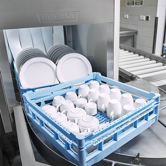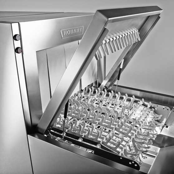 Optymalny wynik suszenia bez wilgotności resztkowej: większość naczyń ma otwory, w których gromadzi się wilgoć. Temu efektowi przeciwdziała strefa wydmuchu urządzeń HOBART. Łopatki rozprowadzające powietrze wydmuchują wilgoć i skapującą wodę z wgłębień.