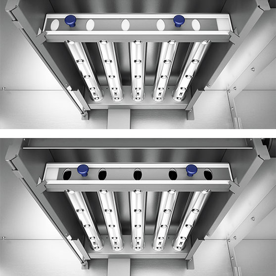 Nasze opatentowane suwaki ramion myjących umożliwiają łatwe i komfortowe czyszczenie wnętrza ramion myjących. Podczas gdy w konwencjonalnych systemach wymagane jest odkręcenie najpierw nasadek końcowych ramion myjących, w celu otwarcia opracowanego przez nas ramienia wystarczy wykonać jedną czynność.
