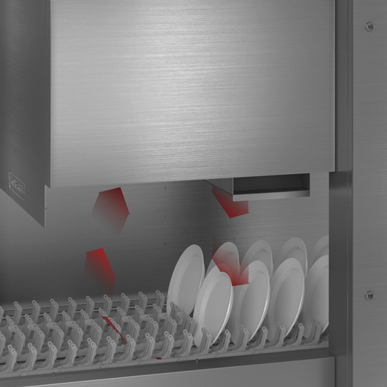 DLA PORÓWNANIA: konwencjonalny system suszenia wdmuchuje z góry gorące powietrze na zmywane artykuły. W rezultacie powietrze jest rozprowadzanie w niekontrolowany sposób. System suszenia 3DRY nie tylko kieruje powietrze na zmywane artykuły w kontrolowany sposób z góry, ale też z boków i z dołu.