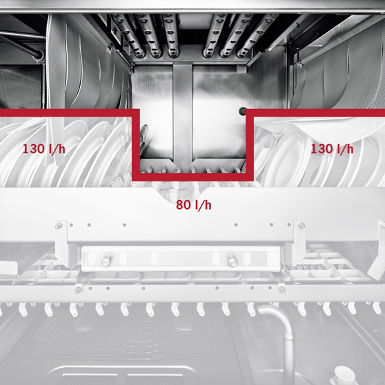 Nowoczesne systemy zmywarek umożliwiają wybranie różnych prędkości przenośnika w reakcji na zmienne objętości naczyń, stopnie zanieczyszczenia lub dostępne czasy zmywania. Kontrola zużycia wody AQUA-ADAPT automatycznie dostosowuje pobieranie świeżej wody na godzinę do wybranej prędkości transportu.
