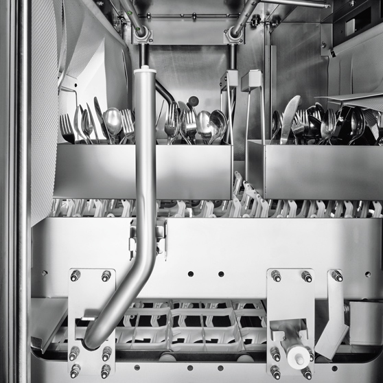 Pracochłonne czynności, takie jak grupowanie i wstępne namaczanie sztućców, często spowalniają i blokują proces czyszczenia. Opcjonalny program do sztućców SHINE kładzie temu kres. Specjalnie opracowane kosze na sztućce i inteligentne czujniki zapewniają automatyczną identyfikację sztućców przez urządzenie. Dlatego system zmywarki do naczyń automatycznie dostosowuje parametry zmywania i płukania w taki sposób, aby osiągnąć optymalny wynik czyszczenia.