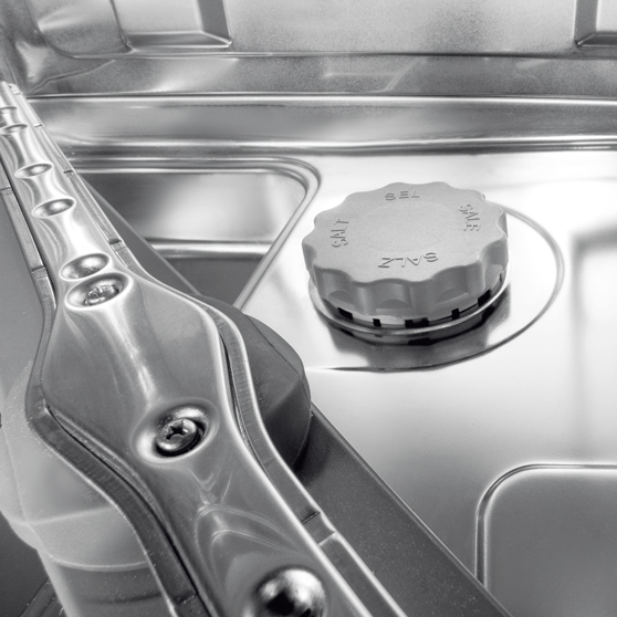 Zintegrowany zmiękczacz wody usuwa z wody substancje mineralne powodujące twardość. Zapobiega to odkładaniu się soli wapnia, co może powodować wydłużenie czasu trwania programów, przepalanie elementów grzejnych i złe efekty zmywania.