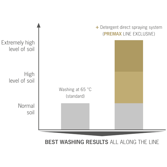 Dlatego w zmywarkach uniwersalnych PREMAX bezpośrednio na naczynia rozpylany jest stężony roztwór detergentu. Ciekły roztwór atakuje pozostałości zanieczyszczeń przed ich wymyciem parowym.