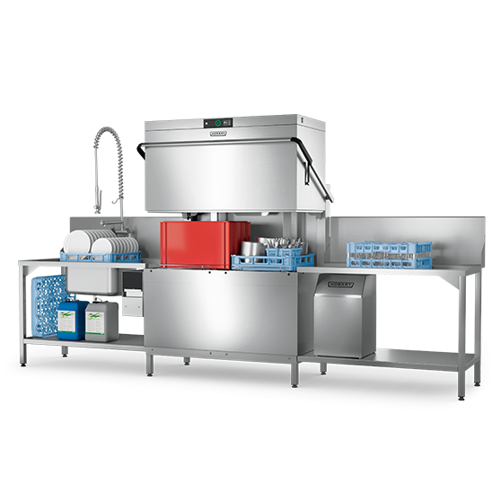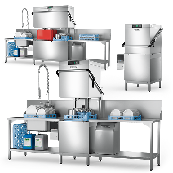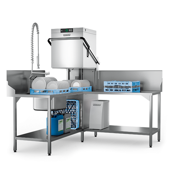 Zmywarki kapturowe do naczyń marki HOBART można ustawić w dowolnym miejscu w kuchni, odpowiednio do sposobu organizacji pracy. Oprócz instalacji wzdłuż ściany pomiędzy stołem do załadunku a stołem do rozładunku naczyń wszystkie zmywarki kapturowe do naczyń można zintegrować do systemu stołów w narożniku.